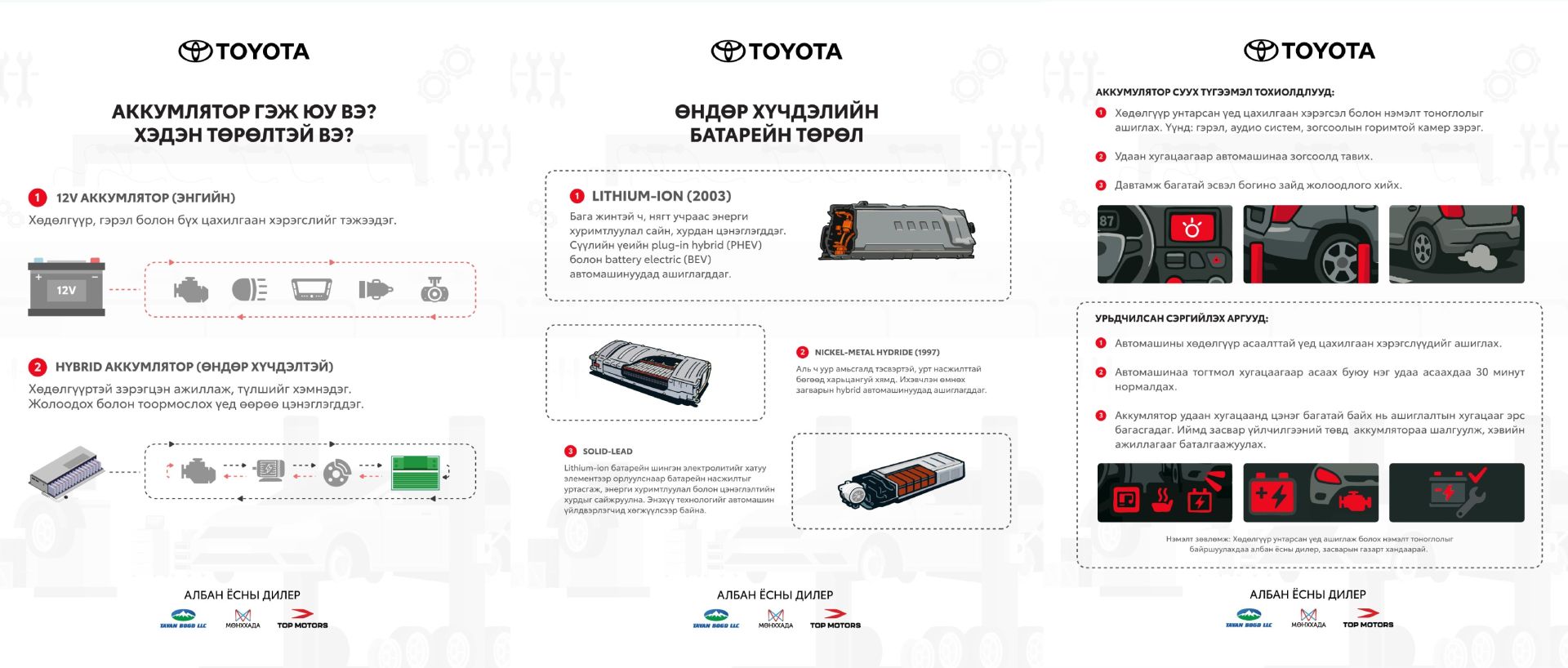 Тоёота автомашины найдвартай ажиллагааг хангахад аккумляторын үүрэг маш чухал. Тоёота автомашинуудад 12V энгийн аккумлятор болон өндөр хүчдэлийн hybrid батарей гэсэн хоёр үндсэн төрөл түлхүү ашиглагддаг. 12V аккумлятор нь хөдөлгүүрийг асаах, гэрэл болон бүх цахилгаан хэрэглэгчдийг тэжээх үндсэн үүрэгтэй бол hybrid өндөр хүчдэлийн батарей нь хөдөлгүүртэй зэрэгцэн ажиллаж, түлшний зарцуулалтыг бууруулж, жолоодлого болон тоормослолтын үед өөрөө цэнэглэгддэг давуу талтай.