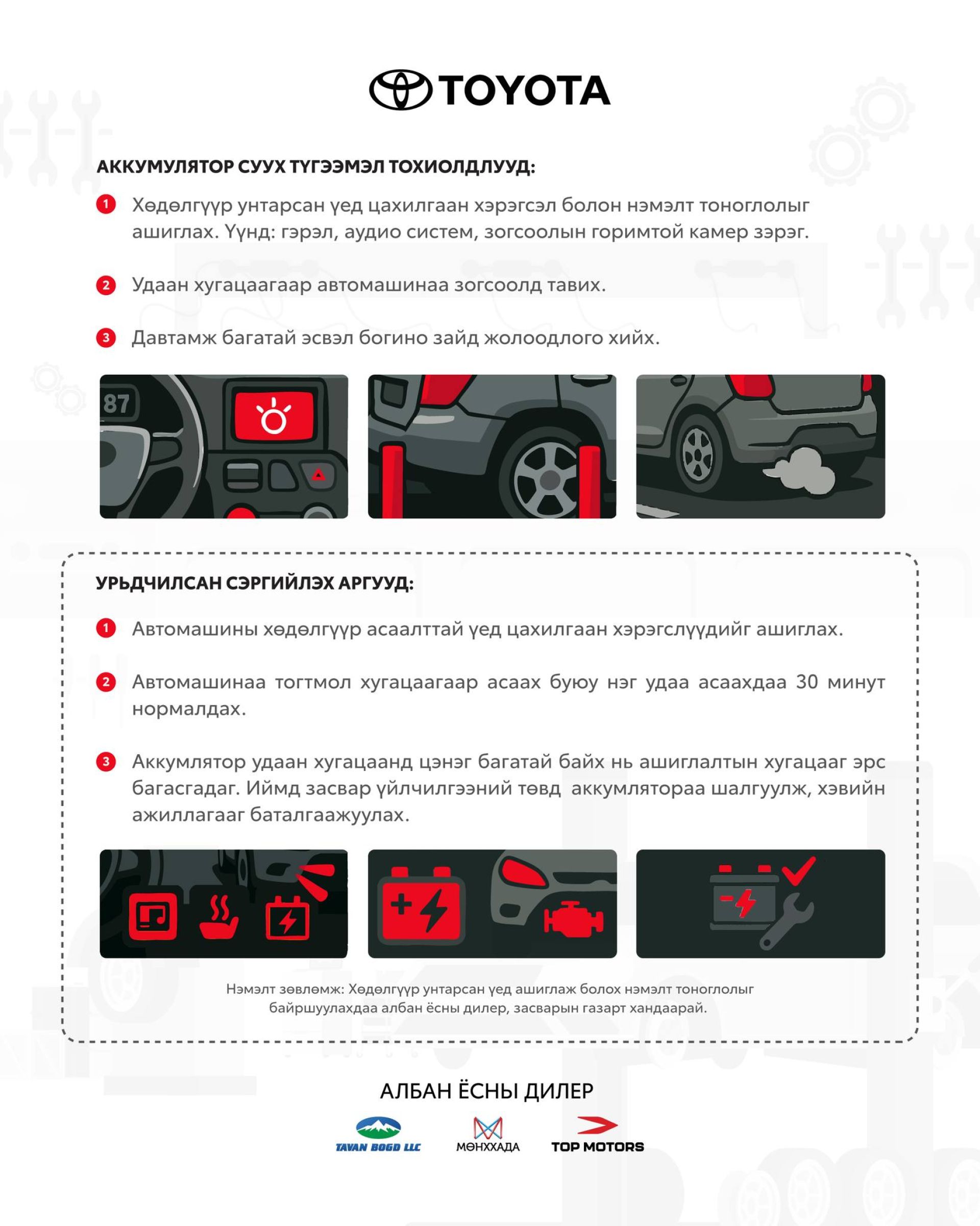 Үүнийг урьдчилан сэргийлэхийн тулд автомашинаа ажиллаж байх үед цахилгаан хэрэглэгч ашиглах, тогтмол хугацаанд дор хаяж 30 минут явж аккумляторыг цэнэглүүлэх, мөн удаан хэрэглээгүй тохиолдолд албан ёсны сервис төвд аккумляторын үзлэг хийлгэх нь зүйтэй. Хэрэв таны автомашин асаалт муудах, гэрэл бүдгэрэх зэрэг шинж илэрвэл албан ёсны дилерийн засварын төвд хандаж аккумляторын оношлоогоо хийлгэхийг зөвлөж байна.